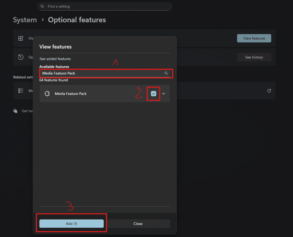 - In the search bar that pops up, type: Media Feature Pack.